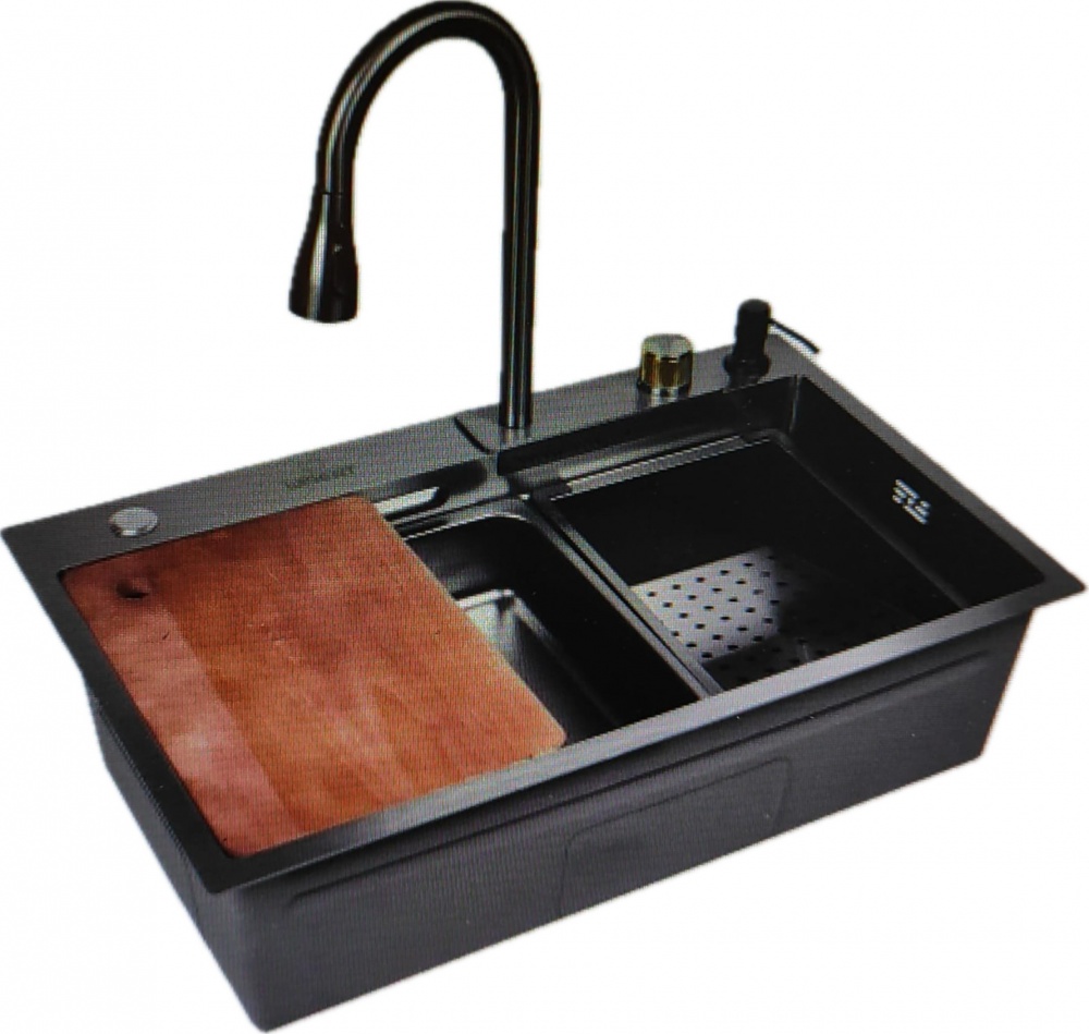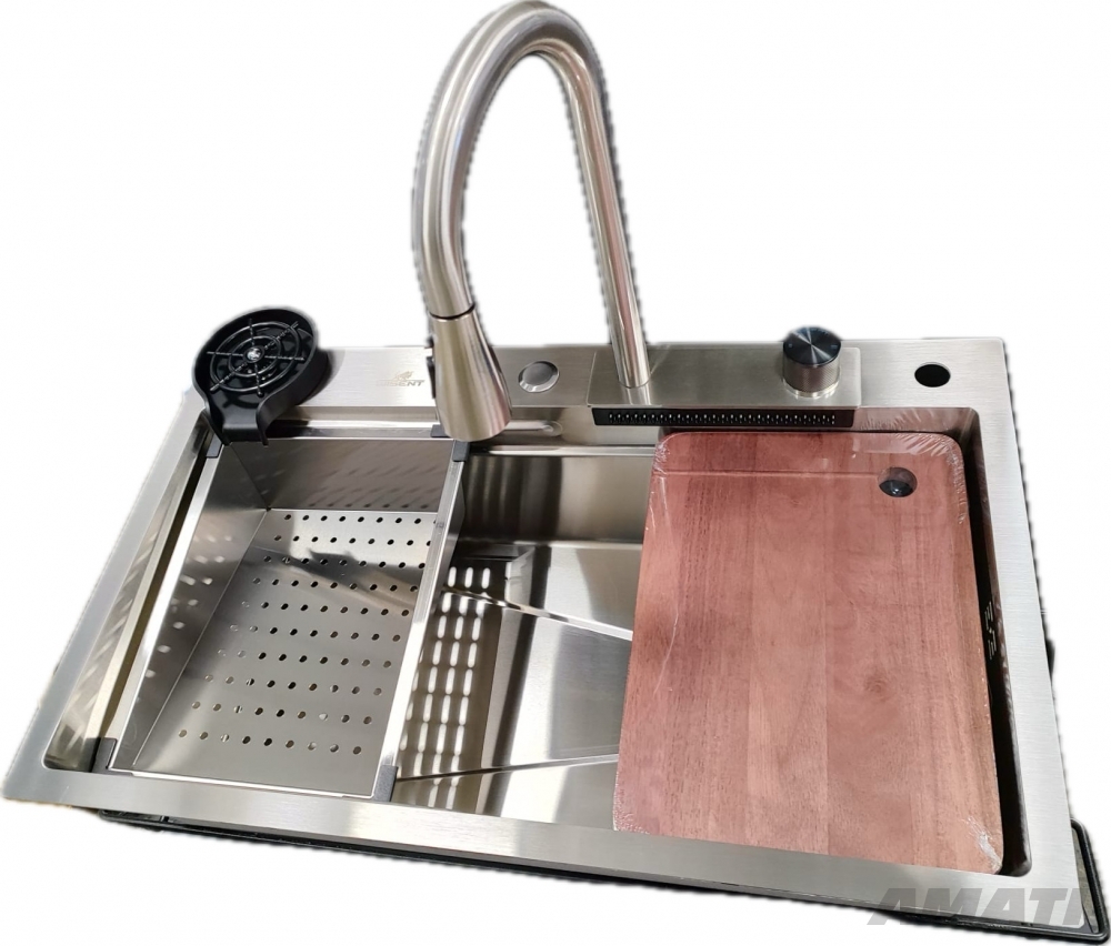 Spüle, Siphon, Wasserhahn, Seifenspender, Gemüsewaschsieb, Korb, Schneidebrett, automatische Gläserspülmaschine.