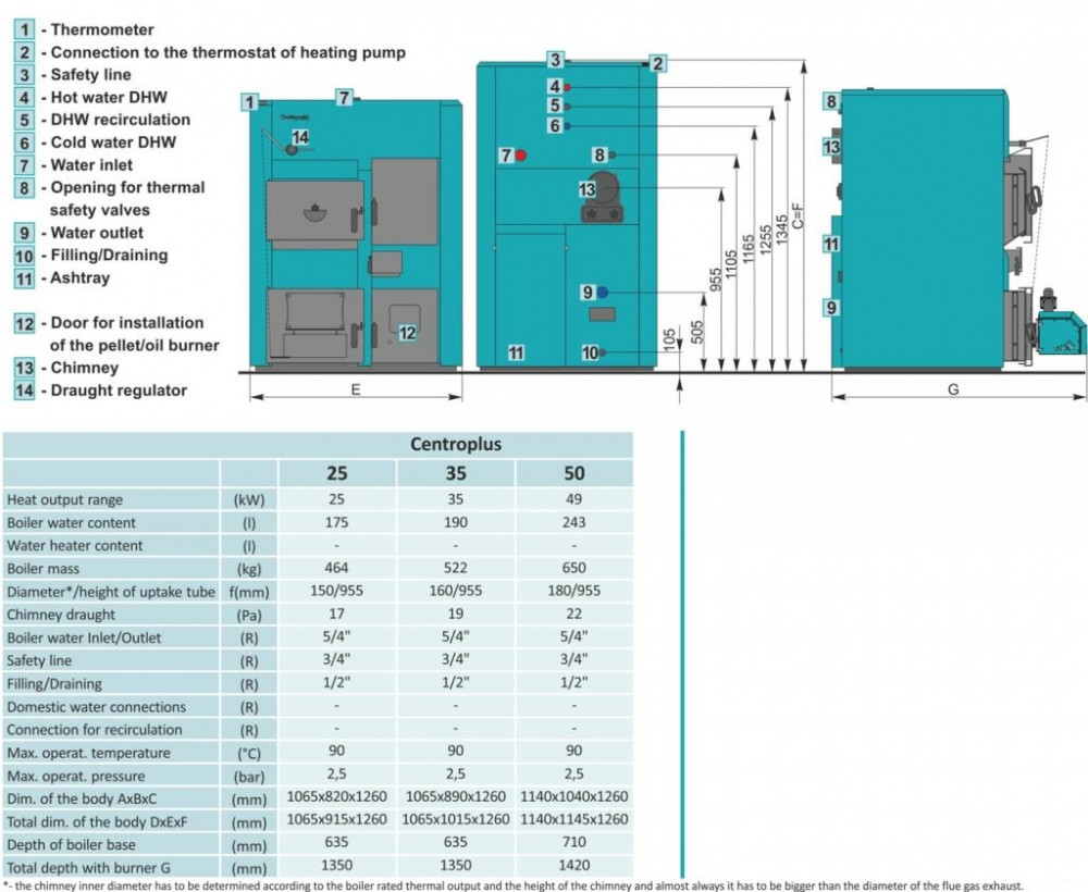 Hot water boiler CentroPlus is intended for central heating and designed for solid fuel, solid and liquid fuel firing, solid fuel and pellet firing and liquid fuel and pellet firing with the rated output of 25, 35 and 49 kW.