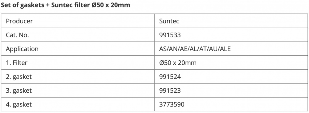 Blīvju komplekts + Suntec filtrs Ø50 x 20mm