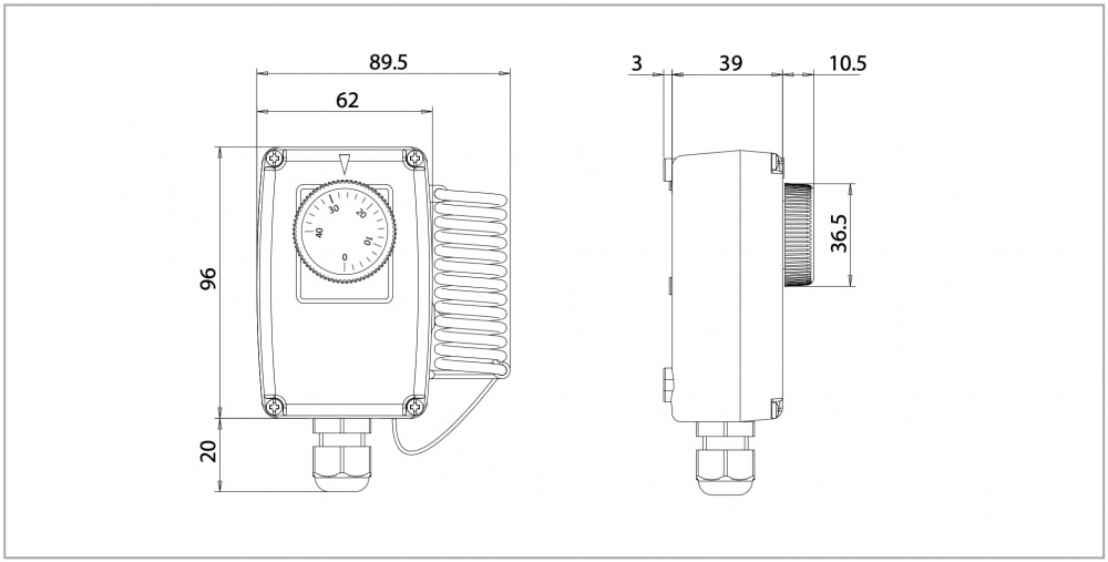 Termostats, ūdensnecaurlaidīgs 0/40°C, savienots ar IP54 spirālveida sensoru