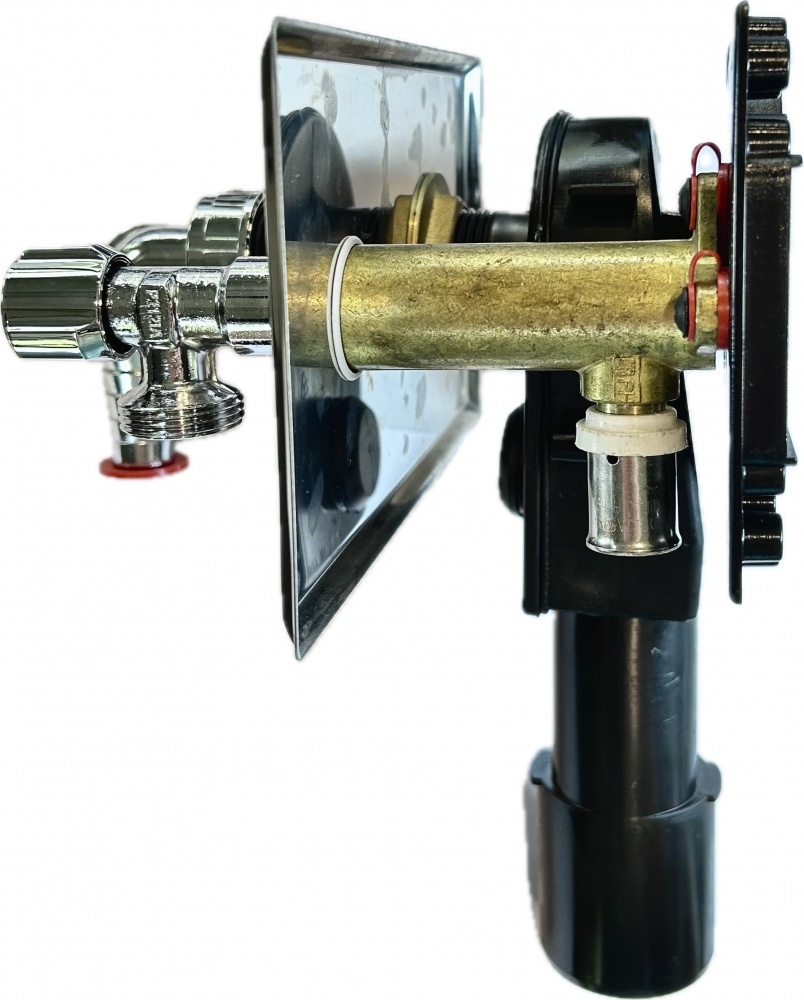 Ar dekoratīvo plāksni, presējamo sienas stiprinājumu, stūra ventīlis veļas mašīnai.