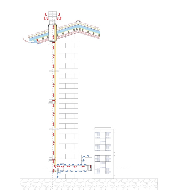 • 90° “T” savienojums apzīmē savienojuma punktu ar dubultsienu skursteņa sistēmu; pateicoties ar minerālvati izolētajam korpusam (biezums 25 mm, blīvums 90 Kg/m3) garantē sistēmas efektivitāti, savukārt tā aste (ar ventilācijas dobuma biezumu 25 mm), atdalīta no korpusa, pateicoties apakšējam multi -perforēts režģis, ļauj iekļūt degšanai nepieciešamajam gaisam (degošajam). Moduļu lineārais elements attēlo savienojuma sistēmu starp ģeneratoru un skursteņa sistēmu. Tas ir modulārs dubultsienu lineārs elements, kam raksturīgs iekšējais kanāls, kas ļauj izvadīt sadegšanas procesos radušos izplūdes produktus un ventilācijas dobums (biezums 25 mm), kas ļauj izvadīt gaisu, kas tiek ņemts no režģi un ar ieplūdes uzmavas (diametrs 60 mm) palīdzību tiek novadīta uz ģeneratoru sadegšanai.