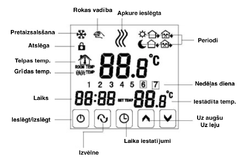 2. Darba dienas laikā tam ir 6 laika periodi un nedēļas nogalē ir 2 laika periodi, kuriem var iestatīt nepieciešamo temperatūru.