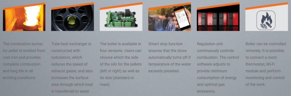 Котел спроектирован с трубчатыми теплообменниками с турбулизаторами, что обеспечивает больший КПД по сравнению с обычными котлами. Трубчатые теплообменники увеличивают площадь теплопередачи, обеспечивая лучшую передачу тепла воде, а турбулизаторы уменьшают поток и температуру выхлопных газов, снижая потребление энергии и гранул.