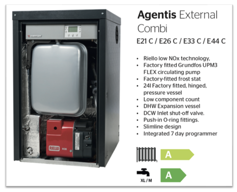 Разработанный для использования на открытом воздухе благодаря классу защиты IP-45, защищенному от атмосферных воздействий и не требующему обслуживания корпусу, он использует уникальный запатентованный теплообменник из нержавеющей стали Warmflow вместе с новейшей технологией горелок Riello Low NOx, чтобы предложить клиентам непревзойденную эффективность и простоту установки. Agentis Combi включает в себя несколько инновационных, лидирующих на рынке функций, таких как установленный на заводе расширительный бак на 24 литра, установленный на заводе предохранительный и предохранительный клапан, а также установленный на заводе мини-расширительный бак для горячей воды.